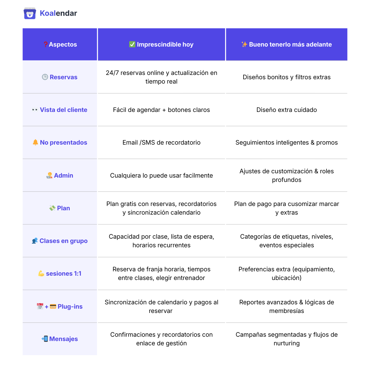 | Tu resultado final | Revisas un solo calendario en lugar de buscar entre los chats | Tu equipo de recepción utiliza el panel de control de Koalendar para ver quién viene cada día | La recepción ve todas las próximas sesiones y clases en una vista compartida. Mejoras la programación sin cambiar por completo tu infraestructura tecnológica. |